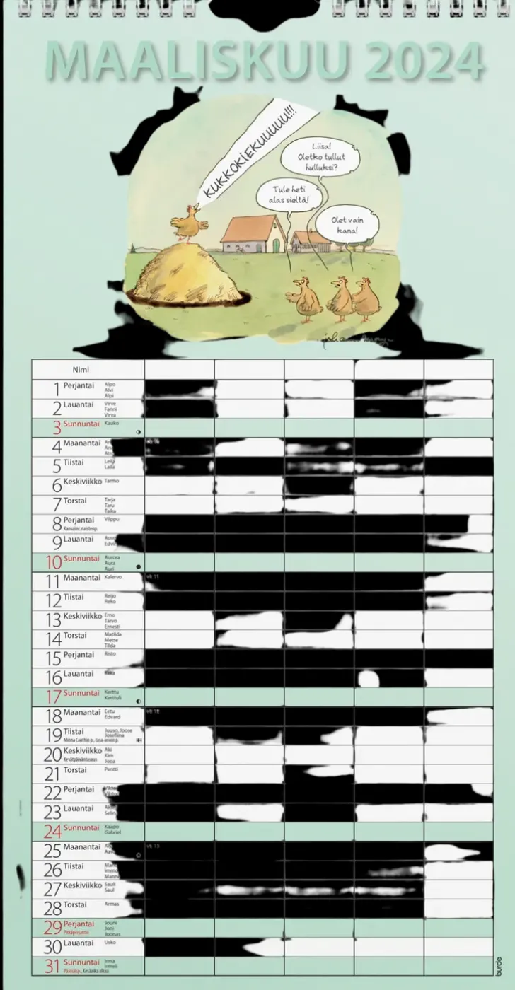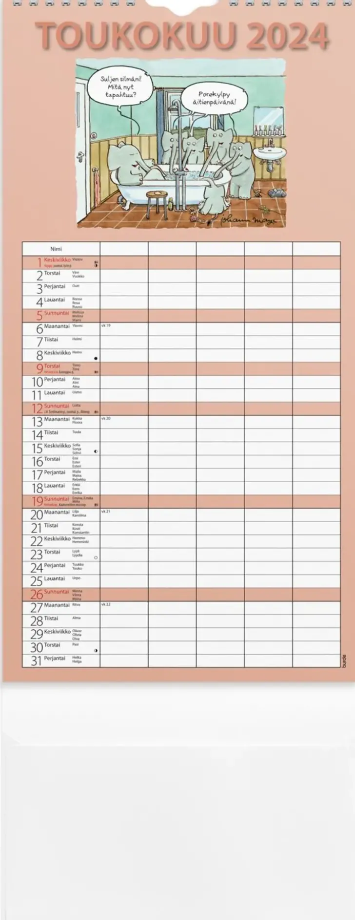 12 Kuvaa. Humoristinen Kalenteri Viidellä Sarakkeella. Kätevä Paperitasku Tärkeille Papereille Ja Kynänpidike. Kalenteri Sisältää Nimipäivät, Liputuspäivät, Juhlapyhät Ja Kuun Vaiheet. Suomenkielinen. Parikierresidottu. Fsc®. Koko (Ilman Taskua): 220X430 Mm.