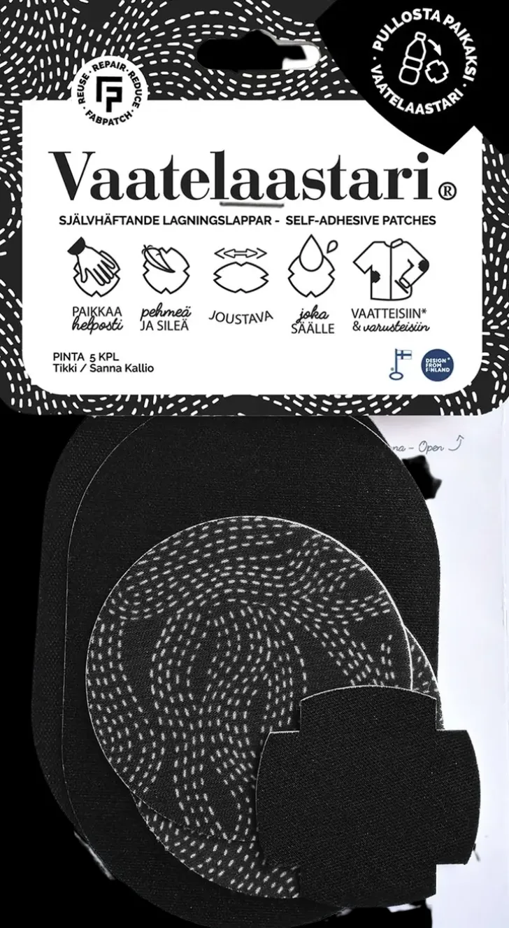 Fabpatch Vaatelaastari On Helppo Hankaamalla Kiinnittyvä Suomessa Valmistettu Tekstiilien Korjauspaikka. Tekstiilimateriaali On 100% Kierrätyspolyesteriä. Valmiiksi Muotoon Leikatut Paikat Ovat Kooltaan: 2 X Maxi 75X110Mm, 2 X Medi 65Mm, 1 X Mini 45X45Mm