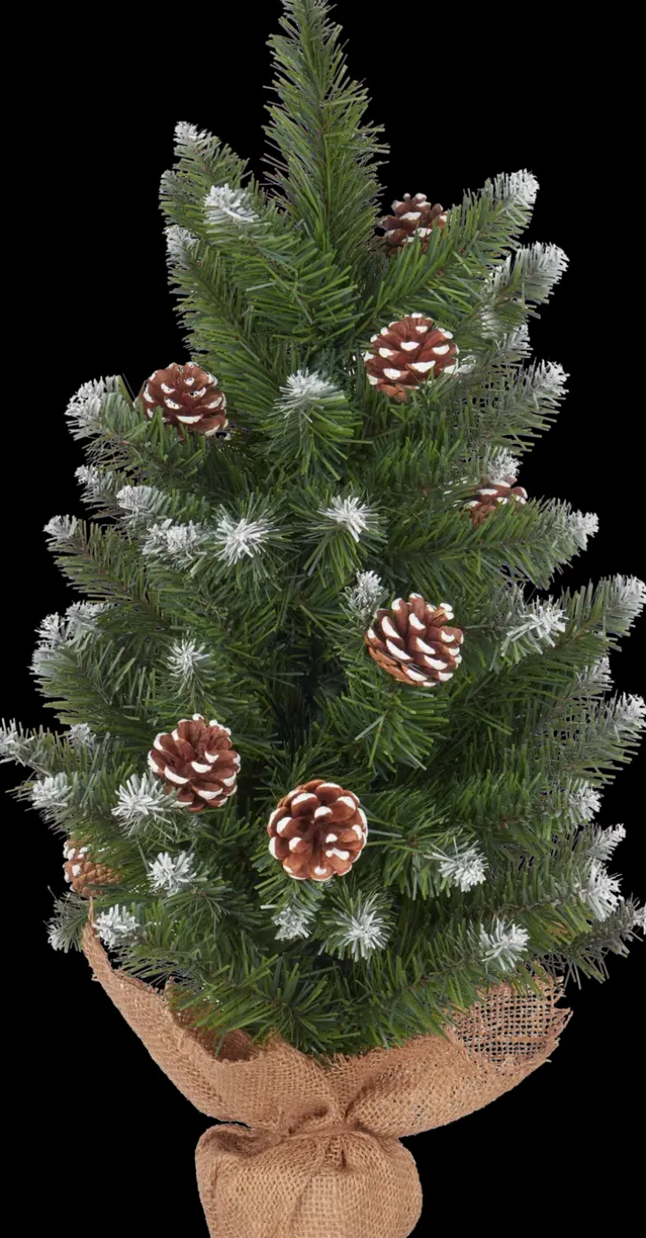Kaunis Luminen Pöytäkuusi, Jossa Koristeena Käpyjä. Kuusessa 72 Oksankärkeä. Korkeus 60 Cm, Halkaisija 35 Cm. Kuusenjalka Juuttisäkissä. Vain Sisäkäyttöön.