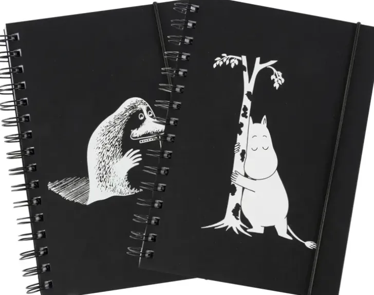 Tyylikäs A5 Kokoinen Muumi Kierremuistikirja Kovilla Kansilla Ja Kuminauhalla. Mustavalkoista Soho -Sarjaa, Jossa Kaksi Eri Kansivahtoehtoa.150 Sivua Viivallista Paperia.