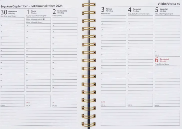 Kovakantinen, Kierresidottu Pöytäkalenteri Kuminauhalla. Koko: A5. Kielisyys: Suomi, Ruotsi. 192 Sivua.