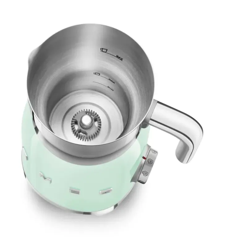 Smeg Maidonvaahdottimessa On Lämmitys Induktiotekniikan Avulla, Jonka Ansiosta Ruostumattomasta Teräksestä Valmistettu Irroitettava Kannu Voidaan Pestä Astianpesukoneessa. Vaahdottimen Kansi Ja Mitta On Valmistettu Kestävästä Tritaanista. Kannun Tilavuus On 500 Ml Lämmittäessä Maitoa Ja 250Ml Maidon Vaahdotukessa. Säätönuppi On Taustavalaistu Ja Laitteessa On Sisäänrakennettu Johdonsäilytys. Maidonvaahdottimen Kokonaisteho On 500 W. Laitteessa On 6 Esiasetettua Ohjelmaa Ja Manuaalinen Ohjelma. Esiasetetut Ohjelmat Ovat: Lämmin Maito Kevyellä Vaahdolla, Lämmin Maito Paksulla Vaahdolla, Kylmä Maito Kevyellä Vaahdolla, Kylmä Maito Paksulla Vaahdolla, Lämmin Maito Ja Lämmin Suklaakaakao. Laitteen Mukana Tulevat Tarvikkeet: Kaksi Maitovispilää.